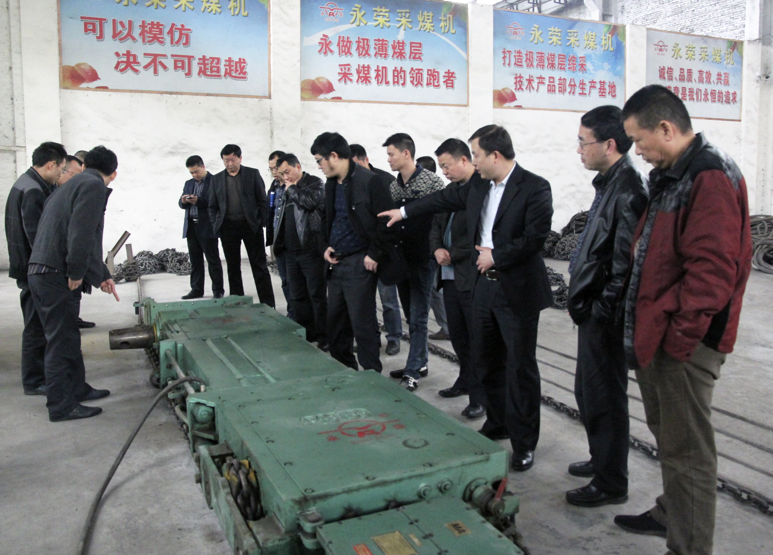 2014年3月27日,在贵州省黔南州安监局副局长李代开的带领下,由煤安局监察员及其下属各市、县煤矿矿长、总工一行24人组成的学习考察团来到永机制公司参观考察极薄煤层采煤机。永荣机制公司董事长、党委书记蒲江平、经理陈明科亲自接待了李局长一行。